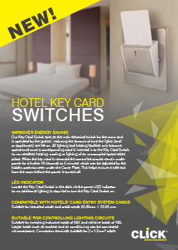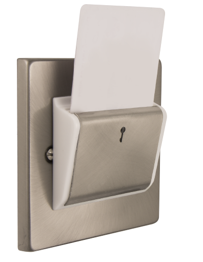 Our Key Card Switch acts as the main electrical switch for the room and is operated by the guests’, reducing the amount of time the lights (and/or appliances) are left on. All lighting and heating facilities only become operational once a corresponding card is inserted in to the Key Card Switch, so no needless heating, cooling or lighting of an unoccupied space takes place. When the key card is removed the controlled circuits remain under power for a further 10 seconds to 5 minutes which can be adjusted by the hidden potentiometer under the Cover Plate. This helps ensure a safe exit from the room before the power is turned off.