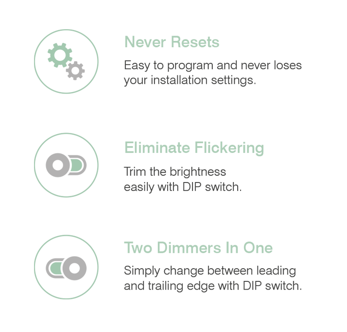 With a choice of dimming modes – leading or trailing edge – installers can choose the mode that works most effectively with the LED lights they are using. The electronics inside some LED lamps have better compatibility with trailing edge and some are better in leading edge.